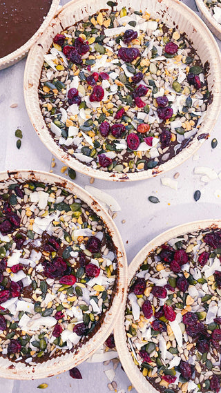 Fullur af náttúrulegum hráefnum sem dreift er ofan á dökkt súkkulaði.