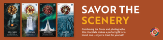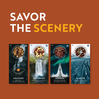 The four unique flavors are inspired by the photo on each piece, which is yours to keep, frame and hold on to. Feel the heat of the volcano, cherish the stillness of the glacier, feel the power of the waterfall or take in the spectacle of the aurora.